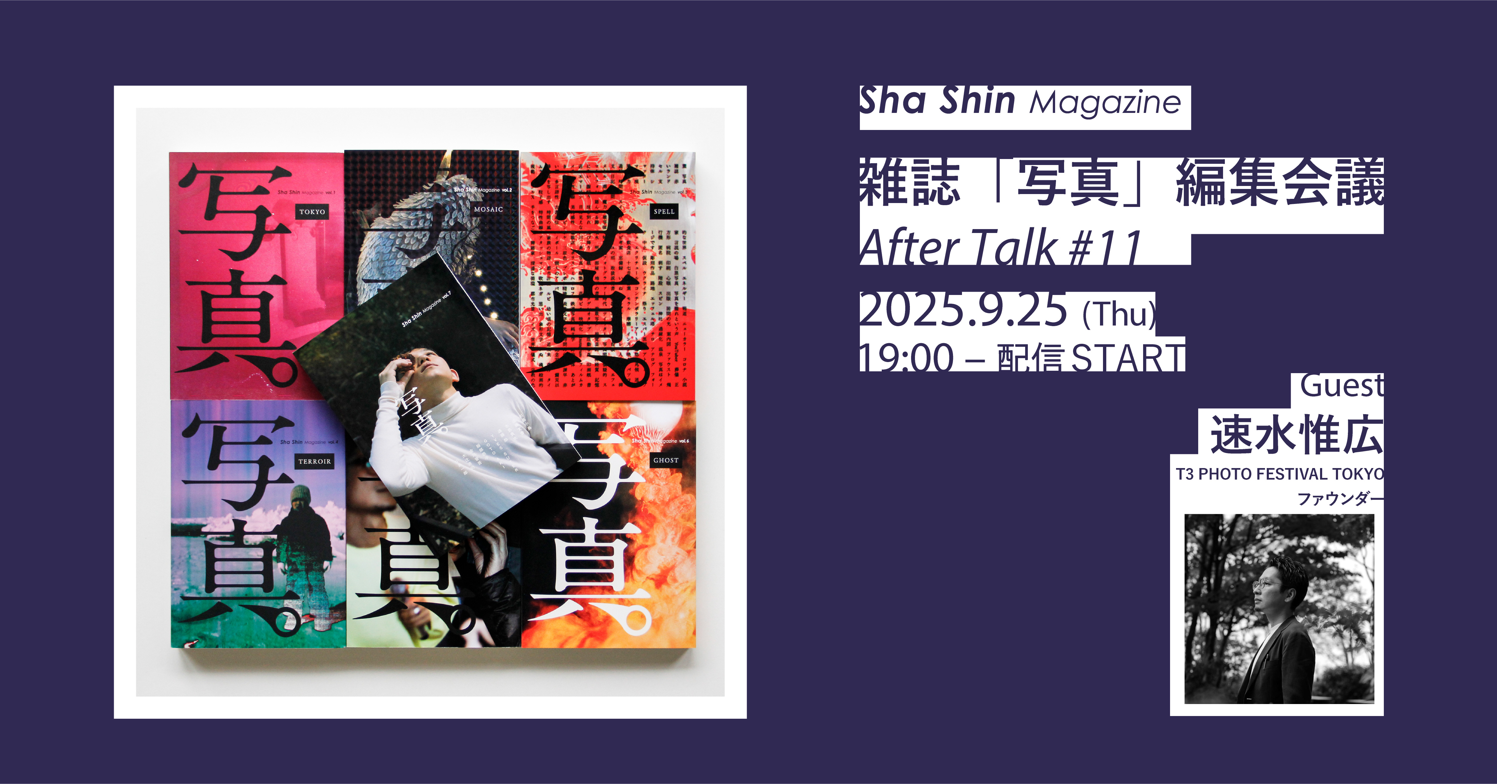 2025/09/25(木) 雑誌『写真』編集会議アフタートーク#11ゲスト:速水惟広 終了しました Event 「雑誌『写真』編集会議 アフタートーク」第11回を、9月25日(木)19:00〜19:30にオンライン配信します。 本番組は、YouTubeチャンネル「ふげん社スタジオビッグバード」と、雑誌『写真』Instagramアカウントでライブ配信いたします。 今回は、ゲストに、T3 PHOTO FESTIVAL TOKYO(東京国際写真祭)ファウンダーの速水惟広さんをゲストにお招きします。 10月4日(土)から10月27日(月)まで「T3 PHOTO FESTIVAL TOKYO 2025」が開催されます。 速水さんの登場は19:15ごろからです。 雑誌『写真』編集長・村上仁一と統括アドバイザー・飯沢耕太郎さんが、次号のコンテンツのご紹介や、最近訪れた展覧会のレビューなど、近況をお話しします。 ぜひ、ご視聴ください! 下記からご覧いただけます。 ■開催概要 雑誌『写真』編集会議アフタートーク#11 2025年9月25日(木)19:00〜配信開始 ふげん社スタジオビッグバードとInstagram(@shashinmagazine)で放送 配信URL:https://youtube.com/live/F8VPRcRtGts?feature=share 出演:村上仁一(編集長)、飯沢耕太郎(統括アドバイザー)、速水惟広(T3 PHOTO FESTIVAL TOKYOファウンダー) ■ 雑誌『写真』について 公式サイト:https://www.shashin.tokyo ・【最新号】vol.7(2025/4/20発行) 詳細はこちら ・vol.6「ゴースト/Ghost」(2024/7/20発行) 詳細はこちら ・vol.5「フェイス/FACES」(2024/1/20発行) 詳細はこちら ・vol.4「テロワール/TERROIR」(2023/7/20発行) 詳細はこちら ・vol.3「スペル/ SPELL」(2023/1/20発行) 詳細はこちら ・vol.2「モザイク/MOSAIC」(2022/7/20発行) 詳細はこちら ・vol.1「東京/TOKYO」(2022/1/20発行)