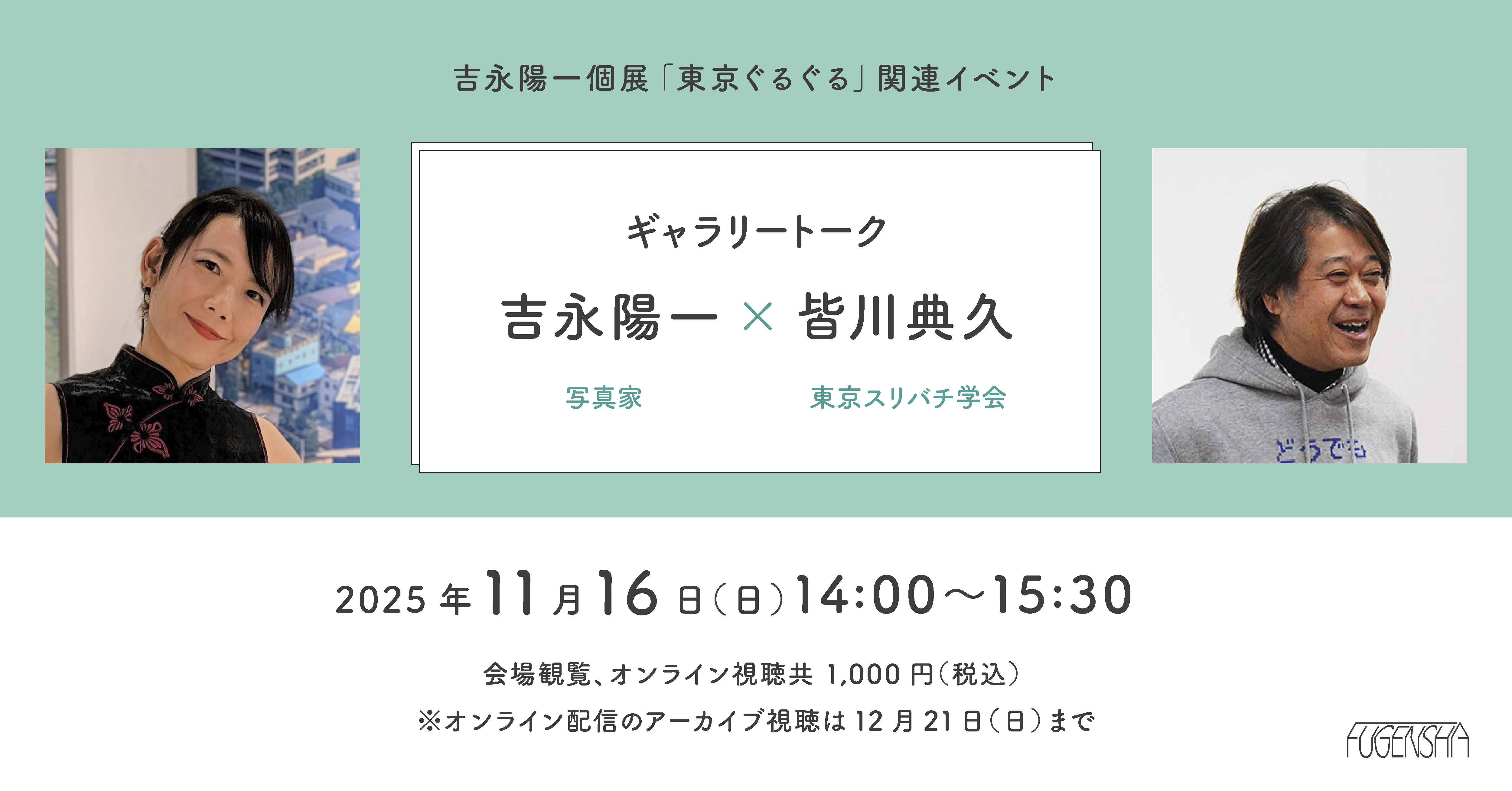 2025/11/16(日) ギャラリートーク吉永陽一×皆川典久(東京スリバチ学会) Event このたび、2025年11月16日(日)に、吉永陽一個展「東京ぐるぐる」(2025.10.31-11.23)のギャラリートークを、会場観覧とオンライン配信のハイブリッドで開催いたします。 ゲストに、東京スリバチ学会の皆川典久さんをお招きします。 オンライン配信は、 2025年12月21日(日)までアーカイブをご覧いただけます。 ■開催概要 ギャラリートーク 吉永陽一×皆川典久(東京スリバチ学会) 日時:2025年11月16日(日)14:00〜15:30 参加費:1000円(会場観覧・オンライン配信) 会場:ふげん社 〒153-0064 東京都目黒区下目黒 5-3-12 TEL:03-6264-3665 MAIL:fugensha.store@gmail.com ゲストプロフィール: 皆川典久 Norihisa Minagawa 東京スリバチ学会会長。鹿島建設建築設計本部勤務。 2003年にランドスケープデザイナーの石川初氏(現在は慶應義塾大学教授)と東京スリバチ学会を設立し、東京都内の凸凹地形に着目してフィールドワークを定期的に開催、観察と記録を続けている。2012年に洋泉社より『凹凸を楽しむ東京「スリバチ」地形散歩』(現在は宝島社から増補改訂版として復刻)を出版し、今日の地形ブームの火付け役となった。TV番組の『タモリ俱楽部』や『ブラタモリ』などに出演。 主な著書に『東京スリバチの達人──分水嶺東京北部編』『東京スリバチの達人──分水嶺東京南部編』(昭文社、2020)や『東京スリバチ街歩き』(イースト新書、2022)などがある。 ■ご参加方法 ふげん社オンラインストアからチケットをご購入ください。 https://fugensha-shop.stores.jp/ ◉会場観覧チケットのご購入はこちら ◉オンライン配信チケットのご購入はこちら ※オンライン配信は、2025年12月21日(日)までアーカイブをご覧いただけます。 ・会場観覧チケットをご購入後にキャンセルされる場合は、開催日の2日前までにふげん社にご連絡ください。それ以降のキャンセルにつきましては、ご返金致しかねますのであらかじめご了承ください。 ・もしオンラインストアからチケットを購入していただくことが難しい場合は、銀行振込や店頭支払い等で対応させていただくことも可能です。お気軽にふげん社(TEL:03-6264-3665 Mail:fugensha.store@gmail.com)までご連絡ください。 ■配信視聴チケットご購入の際の注意事項 ・配信は「YouTubeライブ」を使って実施いたします。ご試聴には、パソコン/スマートフォン/タブレットが必要になりますので、予めご用意ください。 ・ふげん社ストアでご購入後に表示されるPDF(ファイル名:251116_fugensha_online)をダウンロードください。ファイル内に視聴URLが掲載されています。もし不具合がありましたら、ふげん社(TEL:03-6264-3665 Mail:fugensha.store@gmail.com)までご連絡ください。 ・2025年12月21日(日)までアーカイブ動画をご覧頂けます。 ・ご購入者限定でご覧いただける配信です。SNS等へのURLの転載や、動画の転載は固くお断りいたします。 ・配信直前のお問い合わせは対応ができません、時間に余裕を持ってご購入・確認をお願いします。 ・STORES.JPでお支払い(決済)完了のステータスに変わらないとダウンロードのリンクは表示されません。購入後、「支払い(決済)完了」ステータスになる前にPDFや配信URLはお送りできませんのでご了承ください。 ・ネット環境の不良・接続の問題等でご試聴いただけない場合の責任は負いかねます、あしからずご了承ください。 ■展覧会概要 吉永陽一個展「東京ぐるぐる」 会期:2025年10月31日(金)〜11月23日(日) 開館時間:火〜金 12:00〜19:00 土・日 12:00〜18:00 休廊:月曜日 会場:ふげん社 〒153-0064 東京都目黒区下目黒5-3-12 東京都渋谷区出身の空撮写真家・吉永陽一の新刊写真集『東京ぐるぐる』(ふげん社)の刊行記念展を開催いたします。本展では、写真集に収録されている2010年から2025年までの東京の都市部を撮影した103点から約30点を展示いたします。 セスナやヘリコプターに登場して撮影する吉永の空撮写真は、ダイナミックな都市の変遷の貴重な記録であると同時に、鉄道と街と人が交わる日常のワンシーンを、鳥の目という非日常の視点から捉えています。それは、私たちが地上から見ているいつもの景色をぐるりと転回してくれるもので、私たちに新しい視座と軽やかな思考を与えてくれるでしょう。 詳細はこちら