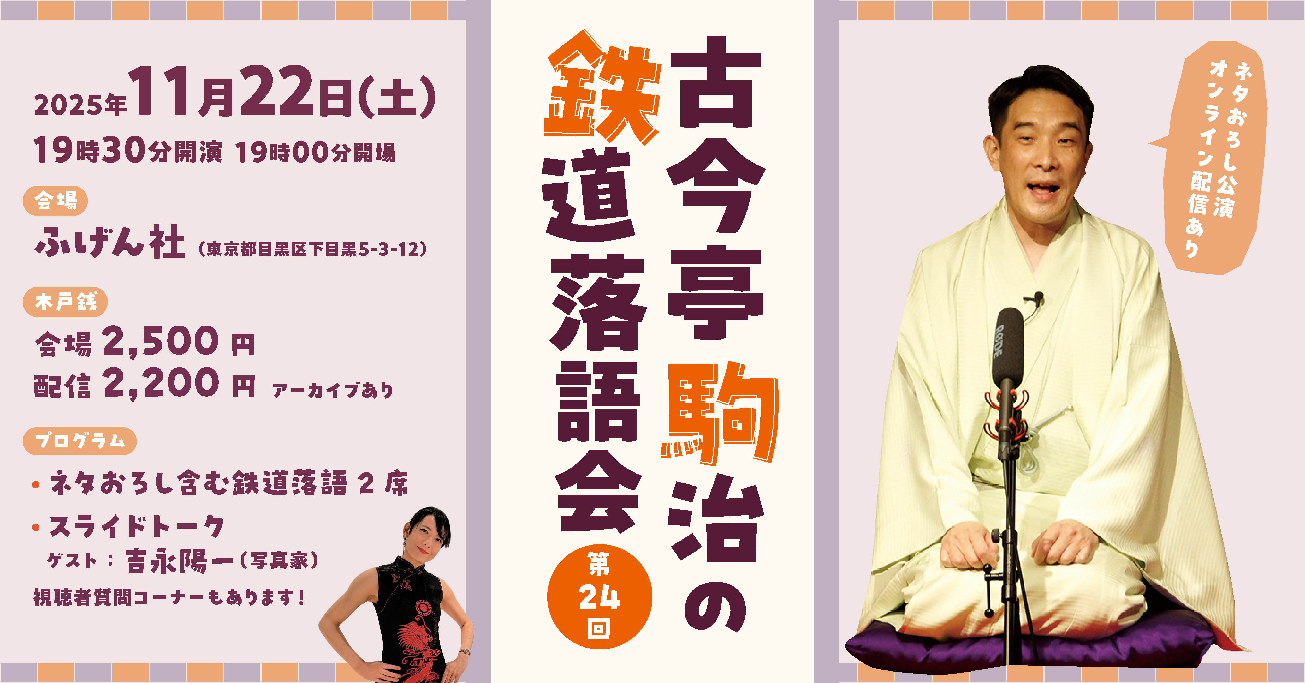 2025/11/22(土) 古今亭駒治の鉄道落語会 第24回会場+オンライン開催ゲスト:吉永陽一(写真家) Event このたび、2025年11月22日(土)19:30開演「古今亭駒治の鉄道落語会」第24回を開催致します。 古今亭駒治師匠は、「鉄道落語」という鉄道にまつわる新作落語を創作している噺家です。 駒治師匠が作り出すお話の「現実からちょっとだけはみ出した」ユニークな世界観は、鉄道マニアのみならず老若男女を魅了しています。 本公演のプログラムは、ネタおろしを含む鉄道落語2席と、旅写真が楽しいスライドトークの3本立て! 今回は、空から鉄道や旅客機を撮影する空撮写真家・吉永陽一さんをゲストにお招きしてスライドトークショーを開催します。 吉永さんの新刊写真集『東京ぐるぐる』掲載作品をスライドショーでご覧いただきながら、駒治さんと吉永さんの息のあった掛け合いをお楽しみください。 当日は、会場で吉永さんの写真展も開催されています。 また、毎回恒例となりました、視聴者の皆さんからのお便りに駒治師匠がお答えする、質問コーナーもございますので、ぜひメッセージやご質問をお寄せください! 子どもから大人まで、鉄道好きはもちろん、マニアでなくともお楽しみいただける駒治師匠の鉄道落語会。 皆様のご参加を心よりお待ちしております。 吉永陽一さんと駒治師匠(2023年7月1日開催鉄道落語会にて) 吉永陽一『東京ぐるぐる』より「千代田区 大手町 2011/03/05」©️Yoichi Yoshinaga ■開催概要 古今亭駒治の鉄道落語会 第24回 会場観覧+オンライン配信 ハイブリッド公演 日時: 2025年11月22日(土) 19時30分 開演(19時00分 開場) 出演:古今亭駒治、吉永陽一(写真家) プログラム: ・鉄道落語二席(ネタおろし一席を含みます) ・スライドトーク ゲスト:吉永陽一(写真家) ・視聴者質問コーナー 木戸銭: 会場観覧 2,500円 オンライン配信 2,200円 会場: ふげん社 〒153-0064 東京都目黒区下目黒5-3-12 TEL:03-6264-3665 MAIL:info@fugensha.jp アクセス: JR目黒駅 西口より東急バス(黒01 黒02 黒07)「元競馬場前」下車 徒歩1分 東横線 祐天寺駅より東急バス(黒06)「元競馬場前」下車 徒歩1分 東横線 中目黒駅より東急バス(黒09)「大鳥神社前」下車 徒歩6分 JR目黒駅より徒歩15分 ■参加申し込み方法 会場観覧、オンライン配信(アーカイブ有)ともに、チケット購入制です。 チケットは下記オンラインストアよりお求めください。 https://fugensha-shop.stores.jp/ ◉会場観覧チケットのご購入はこちら ◉オンライン配信チケットのご購入はこちら オンライン配信は、11月25日(火)までアーカイブをご視聴いただけます。 ・オンライン購入が難しい場合は、銀行振込や店頭支払いなどで対応させていただくことも可能です。お気軽にふげん社(TEL:03-6264-3665 Mail:fugensha.store@gmail.com)までご連絡ください。 ・会場観覧チケットをご購入後にキャンセルされる場合は、開催日の2日前までにふげん社にご連絡ください。それ以降のキャンセルにつきましては、ご返金致しかねますので、あらかじめご了承ください。 ・配信チケット購入の際の注意事項はページ下部に記載しておりますのでご確認ください。 ■質問コーナーへの応募方法 駒治師匠への質問、応援メッセージなど、 投稿者名(ペンネーム可)とともに、下記のいずれかの方法でお送りください。 いただいたお便りは公演内で取り上げさせていただくことがございます。 締切:11/21(金) ※質問はおひとり様1つまで 180字以内でお願いします。 ①オンラインストアでチケットご購入の際に、【備考欄】に記入する。 ②メールで送信する。 件名:駒治メッセージ 本文:チケットご購入の際のお名前もお書き添えください。 宛先:fugensha.store@gmail.com ■出演者プロフィール 古今亭駒治 1978年(昭和53年) 東京都渋谷区幡ヶ谷生まれ 2003年(平成15年) 玉川大学卒業後、古今亭志ん駒に入門 「駒次」 2007年(平成19年) 二つ目昇進 2010年(平成22年) 共同通信社主催東西落語家コンペティショングランプリ受賞「公園のひかり号」 2013年(平成25年) 交通新聞社新書「鉄道落語」を共著(柳家小ゑん、桂梅団治、桂しん吉)で出版。「鉄道戦国絵巻」「都電物語」を収録 2017年(平成29年) しぶやらくご創作落語大賞受賞「10時打ち」 2018年(平成30年) 古今亭志ん駒死去にともない、古今亭志ん橋に入門。 真打昇進「駒治」に改名 現在 自作の新作落語で活躍。 身近なテーマを落語にしている。 特に鉄道落語は、寄席や鉄道落語会の他、鉄道博物館、東武鉄道ファンフェスタ、京急鉄道フェスタ、東急東横店イベント、池上線開業90周年祭、池上線雪が谷大塚車庫内での落語会、三陸鉄道復興寄席、荒川区都電写真展、都電落語会、弘南鉄道大鰐線、旧新橋停車場鉄道歴史展示室など、様々な場所で披露している。 出囃子:鉄道唱歌 紋:鬼蔦、青がえる 趣味:鉄道に乗ること 前駅を調査すること スワローズを応援すること CHAGE&ASKAの音楽を聞くこと 座右の銘:毎日が試運転 https://komaji.net/ ■ゲストプロフィール 吉永陽一 Yoichi Yoshinaga 1977年東京都渋谷区生まれ。 大阪芸