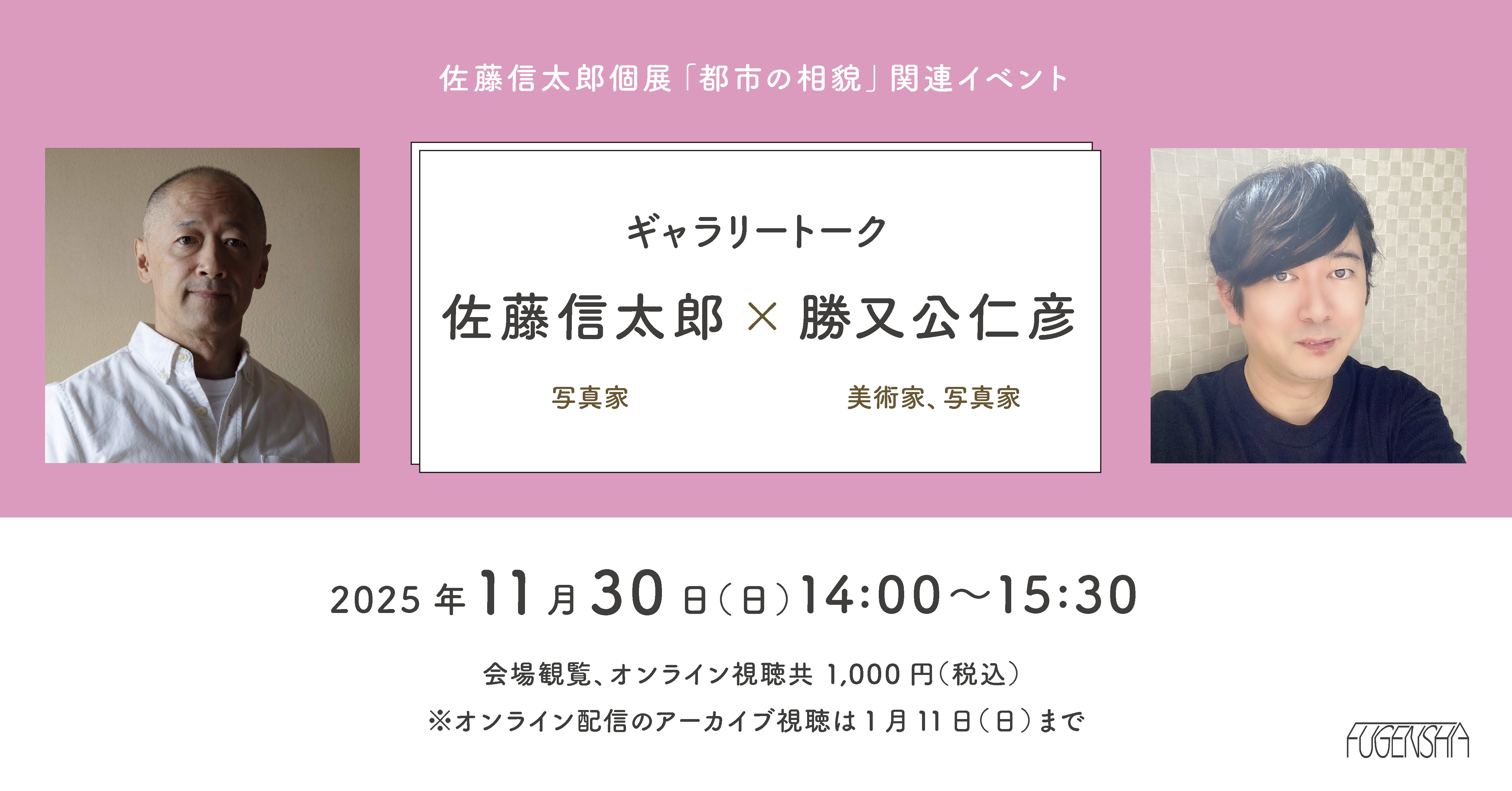 2025/11/30(日) ギャラリートーク佐藤信太郎×勝又公仁彦(美術家、写真家) Event このたび、2025年11月30日(日)に、佐藤信太郎個展「都市の相貌」のギャラリートークを、会場観覧とオンライン配信のハイブリッドで開催いたします。 ゲストに、美術家・写真家の勝又公仁彦さんをお招きします。 オンライン配信は、 2026年1月11日(日)までアーカイブをご覧いただけます。 ■開催概要 ギャラリートーク 佐藤信太郎×勝又公仁彦(美術家、写真家) 日時:2025年11月30日(日)14:00〜15:30 トーク終了後に、レセプションを開催。ご自由にご参加ください。 参加費:1000円(会場観覧・オンライン配信) 会場:ふげん社 〒153-0064 東京都目黒区下目黒 5-3-12 TEL:03-6264-3665 MAIL:fugensha.store@gmail.com ゲストプロフィール: 勝又公仁彦 KATSUMATA Kunihiko 静岡県出身。早稲田大学法学部卒業。インターメディウム研究所修了。美術家、写真家。写真を中心とした映像メディアで作品を制作。主な展覧会、受賞、作品集:「写真の現在2 —サイト— 場所と光景」(東京国立近代美術館、2002年)、「日本写真協会新人賞」(2005年)、『Compilation of photo series until 201X Vol.1』(Media Passage、2018)。現在、京都芸術大学教授、多摩美術大学非常勤講師。2025年12月に赤々舎より新刊の写真集を発行予定。 ■ご参加方法 ふげん社オンラインストアからチケットをご購入ください。 https://fugensha-shop.stores.jp/ ◉会場観覧チケットのご購入はこちら ◉オンライン配信チケットのご購入はこちら ※オンライン配信は、2026年1月11日(日)までアーカイブをご覧いただけます。 ・会場観覧チケットをご購入後にキャンセルされる場合は、開催日の2日前までにふげん社にご連絡ください。それ以降のキャンセルにつきましては、ご返金致しかねますのであらかじめご了承ください。 ・もしオンラインストアからチケットを購入していただくことが難しい場合は、銀行振込や店頭支払い等で対応させていただくことも可能です。お気軽にふげん社(TEL:03-6264-3665 Mail:fugensha.store@gmail.com)までご連絡ください。 ■配信視聴チケットご購入の際の注意事項 ・配信は「YouTubeライブ」を使って実施いたします。ご試聴には、パソコン/スマートフォン/タブレットが必要になりますので、予めご用意ください。 ・ふげん社ストアでご購入後に表示されるPDF(ファイル名:251130_fugensha_online)をダウンロードください。ファイル内に視聴URLが掲載されています。もし不具合がありましたら、ふげん社(TEL:03-6264-3665 Mail:fugensha.store@gmail.com)までご連絡ください。 ・2026年1月11日(日)までアーカイブ動画をご覧頂けます。 ・ご購入者限定でご覧いただける配信です。SNS等へのURLの転載や、動画の転載は固くお断りいたします。 ・配信直前のお問い合わせは対応ができません、時間に余裕を持ってご購入・確認をお願いします。 ・STORES.JPでお支払い(決済)完了のステータスに変わらないとダウンロードのリンクは表示されません。購入後、「支払い(決済)完了」ステータスになる前にPDFや配信URLはお送りできませんのでご了承ください。 ・ネット環境の不良・接続の問題等でご試聴いただけない場合の責任は負いかねます、あしからずご了承ください。 ■新刊案内 佐藤信太郎『都市の相貌』 2025年11月16日発行 著者:佐藤信太郎 寄稿:上野 修 造本:町口 覚 発行所:ふげん社 サイズ:A4変型 頁数:208頁 写真点数:176点 定価:税込11,000円(本体価格10,000円) ISBN 978-4-908955-46-4 ■展覧会概要 佐藤信太郎個展「都市の相貌」 会期:2025年11月28日(金)〜12月25日(木) 開館時間:火〜金 12:00〜19:00 土・日 12:00〜18:00 ※最終日12月25日(木)のみ18:00まで 休廊:月曜日 会場:ふげん社 〒153-0064 東京都目黒区下目黒5-3-12 佐藤信太郎新刊写真集『都市の相貌』(ふげん社)の刊行記念展を開催します。本書収録の1990年から2025年までの全8シリーズから21点を展示します。「非常階段東京」(日本写真協会賞新人賞受賞作)や「東京|天空樹」(林忠彦賞受賞作)はもちろん、学生時代の未発表作や最新作「Boundaries」まで、佐藤作品はその時代の最新技術を駆使しながらストレートフォトからデジタルコラージュまで自在に変化してきました。昼と夜、具体と抽象、見えるものと見えないものを行き来しながら「都市の相貌」を捉えようと歩んできた作家の35年間の軌跡を写真集とともにご覧ください。 詳細はこちら