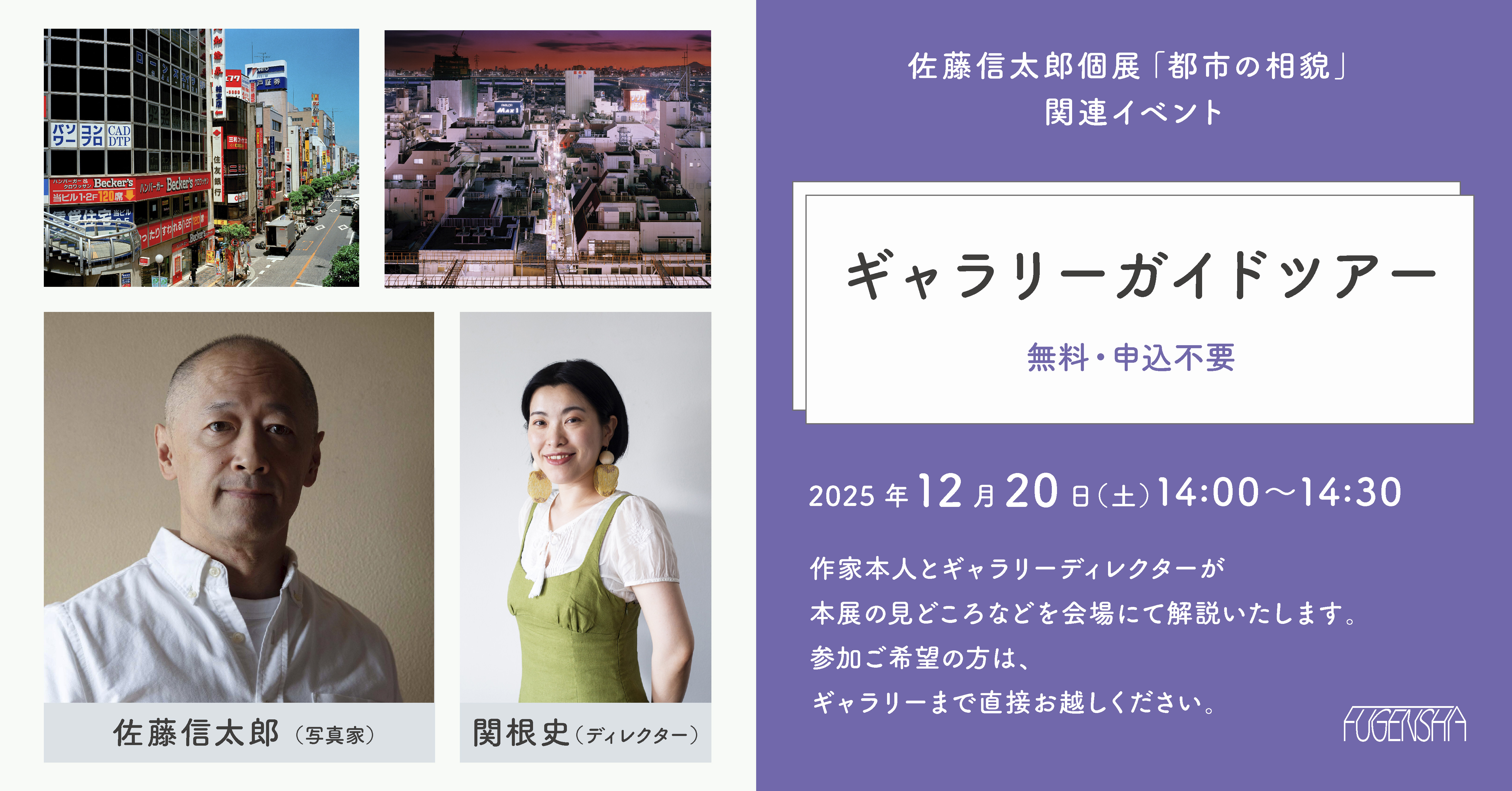 2025/12/20(土) 佐藤信太郎個展 「都市の相貌」ギャラリーガイドツアー Event このたび、佐藤信太郎個展「都市の相貌」(2025.11.28-12.25)会期中に、ガイドツアーを開催いたします。 作家本人とギャラリーディレクターが本展の見所などを展覧会場にて解説いたします。 作家から直接話を聞いてみたい、という方はぜひご予定の上ご来場ください。 ■開催概要 佐藤信太郎個展「都市の相貌」 ギャラリーガイドツアー 開催日時:12月20日(土)14:00〜14:30 参加費:無料 会場:ふげん社 〒153-0064 東京都目黒区下目黒 5-3-12 TEL:03-6264-3665 MAIL:info@fugensha.jp https://fugensha.jp ■ご参加方法 ご予約不要です。参加ご希望の方は、お気軽にギャラリーにお越しください。 ■展覧会概要 佐藤信太郎個展「都市の相貌」 会期:2025年11月28日(金)〜12月25日(木) 開館時間:火〜金 12:00〜19:00 土・日 12:00〜18:00 ※最終日12月25日(木)のみ18:00まで 休廊:月曜日 会場:ふげん社 〒153-0064 東京都目黒区下目黒5-3-12 佐藤信太郎新刊写真集『都市の相貌』(ふげん社)の刊行記念展を開催します。本書収録の1990年から2025年までの全8シリーズから21点を展示します。「非常階段東京」(日本写真協会賞新人賞受賞作)や「東京|天空樹」(林忠彦賞受賞作)はもちろん、学生時代の未発表作や最新作「Boundaries」まで、佐藤作品はその時代の最新技術を駆使しながらストレートフォトからデジタルコラージュまで自在に変化してきました。昼と夜、具体と抽象、見えるものと見えないものを行き来しながら「都市の相貌」を捉えようと歩んできた作家の35年間の軌跡を写真集とともにご覧ください。 詳細はこちら