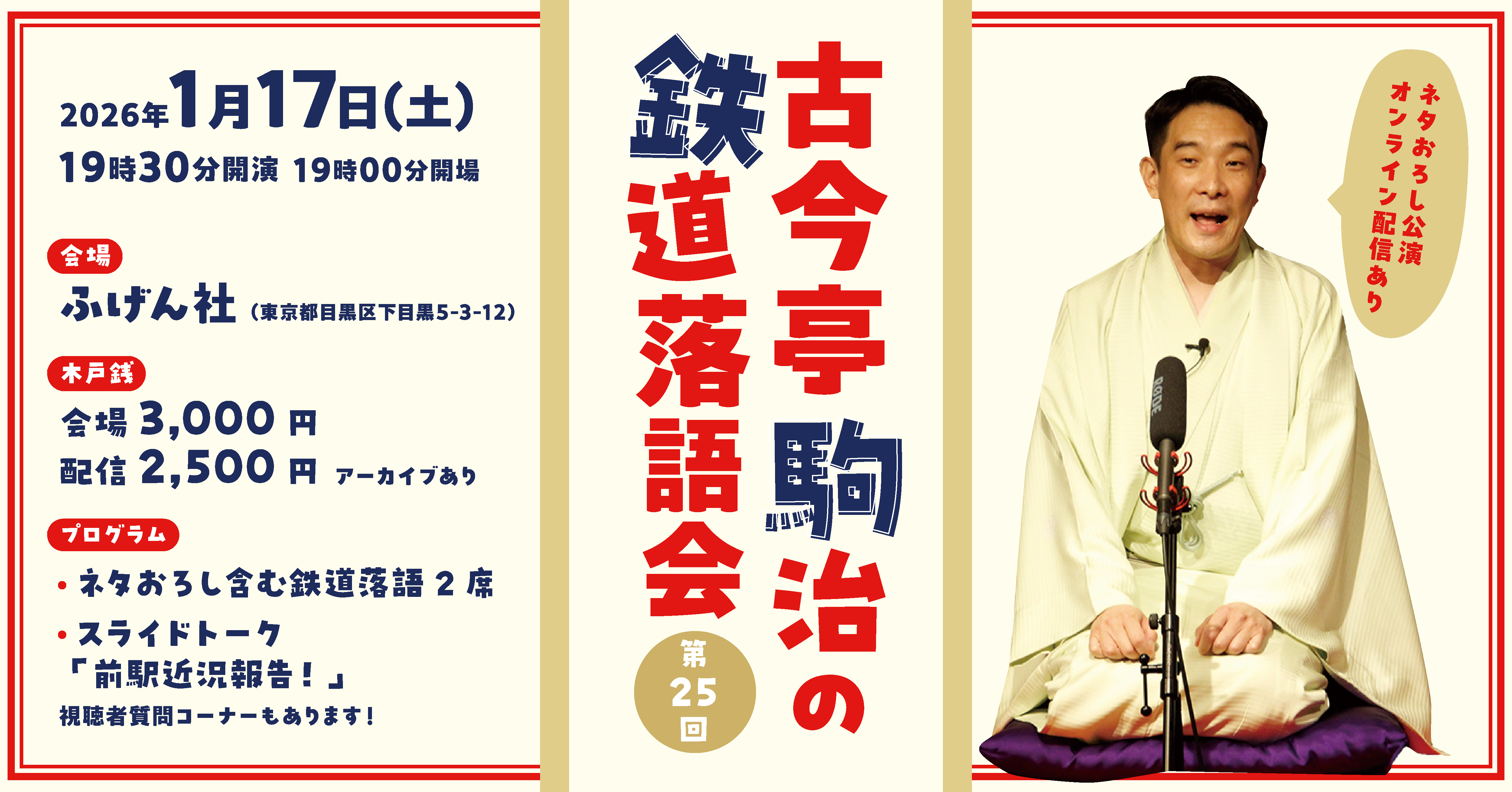 2026/01/17(土) 古今亭駒治の鉄道落語会 第25回会場+オンライン開催 Event このたび、2026年1月17日(土)19:30開演「古今亭駒治の鉄道落語会」第25回を開催致します。 古今亭駒治師匠は、「鉄道落語」という鉄道にまつわる新作落語を創作している噺家です。 駒治師匠が作り出すお話の「現実からちょっとだけはみ出した」ユニークな世界観は、鉄道マニアのみならず老若男女を魅了しています。 本公演のプログラムは、ネタおろしを含む鉄道落語2席と、旅写真が楽しいスライドトークの3本立て! 今回のスライドトークの演目は「前駅近況報告!」です。 毎回恒例となりました、視聴者の皆さんからのお便りに駒治師匠がお答えする、質問コーナーもございます。 ぜひメッセージやご質問をお寄せください!子どもから大人まで、鉄道好きはもちろん、マニアでなくともお楽しみいただける駒治師匠の鉄道落語会。 皆様のご参加を心よりお待ちしております。 ■開催概要 古今亭駒治の鉄道落語会 第25回 会場観覧+オンライン配信 ハイブリッド公演 日時: 2026年1月17日(土) 19時30分 開演(19時00分 開場) 出演:古今亭駒治 プログラム: ・鉄道落語二席(ネタおろし一席を含みます) ・スライドトーク「前駅近況報告!」 ・視聴者質問コーナー 木戸銭: 会場観覧 3,000円 オンライン配信 2,500円 会場: ふげん社 〒153-0064 東京都目黒区下目黒5-3-12 TEL:03-6264-3665 MAIL:info@fugensha.jp アクセス: JR目黒駅 西口より東急バス(黒01 黒02 黒07)「元競馬場前」下車 徒歩1分 東横線 祐天寺駅より東急バス(黒06)「元競馬場前」下車 徒歩1分 東横線 中目黒駅より東急バス(黒09)「大鳥神社前」下車 徒歩6分 JR目黒駅より徒歩15分 ■参加申し込み方法 会場観覧、オンライン配信(アーカイブ有)ともに、チケット購入制です。 チケットは下記オンラインストアよりお求めください。 https://fugensha-shop.stores.jp/ ◉会場観覧チケットのご購入はこちら ◉オンライン配信チケットのご購入はこちら オンライン配信は、1月20日(火)までアーカイブをご視聴いただけます。 ・オンライン購入が難しい場合は、銀行振込や店頭支払いなどで対応させていただくことも可能です。お気軽にふげん社(TEL:03-6264-3665 Mail:fugensha.store@gmail.com)までご連絡ください。 ・会場観覧チケットをご購入後にキャンセルされる場合は、開催日の2日前までにふげん社にご連絡ください。それ以降のキャンセルにつきましては、ご返金致しかねますので、あらかじめご了承ください。 ・配信チケット購入の際の注意事項はページ下部に記載しておりますのでご確認ください。 ■質問コーナーへの応募方法 駒治師匠への質問、応援メッセージなど、 投稿者名(ペンネーム可)とともに、下記のいずれかの方法でお送りください。 いただいたお便りは公演内で取り上げさせていただくことがございます。 締切:1/16(金) ※質問はおひとり様1つまで 180字以内でお願いします。 ①オンラインストアでチケットご購入の際に、【備考欄】に記入する。 ②メールで送信する。 件名:駒治メッセージ 本文:チケットご購入の際のお名前もお書き添えください。 宛先:fugensha.store@gmail.com ■出演者プロフィール 古今亭駒治 1978年(昭和53年) 東京都渋谷区幡ヶ谷生まれ 2003年(平成15年) 玉川大学卒業後、古今亭志ん駒に入門 「駒次」 2007年(平成19年) 二つ目昇進 2010年(平成22年) 共同通信社主催東西落語家コンペティショングランプリ受賞「公園のひかり号」 2013年(平成25年) 交通新聞社新書「鉄道落語」を共著(柳家小ゑん、桂梅団治、桂しん吉)で出版。「鉄道戦国絵巻」「都電物語」を収録 2017年(平成29年) しぶやらくご創作落語大賞受賞「10時打ち」 2018年(平成30年) 古今亭志ん駒死去にともない、古今亭志ん橋に入門。 真打昇進「駒治」に改名 現在 自作の新作落語で活躍。 身近なテーマを落語にしている。 特に鉄道落語は、寄席や鉄道落語会の他、鉄道博物館、東武鉄道ファンフェスタ、京急鉄道フェスタ、東急東横店イベント、池上線開業90周年祭、池上線雪が谷大塚車庫内での落語会、三陸鉄道復興寄席、荒川区都電写真展、都電落語会、弘南鉄道大鰐線、旧新橋停車場鉄道歴史展示室など、様々な場所で披露している。 出囃子:鉄道唱歌 紋:鬼蔦、青がえる 趣味:鉄道に乗ること 前駅を調査すること スワローズを応援すること CHAGE&ASKAの音楽を聞くこと 座右の銘:毎日が試運転 https://komaji.net/ ■配信チケットご購入の際の注意事項 ・配信は「YouTubeライブ」を使って実施いたします。ご試聴には、パソコン/スマートフォン/タブレットが必要になりますので、予めご用意ください。 ・1月20日(火)までアーカイブをご覧頂けます。 ・ふげん社ストアでご購入後に表示されるPDF(ファイル名:260117_komaji_online.pdf)をダウンロードください。ファイル内に視聴URLが掲載されています。もし不具合がありましたら、ふげん社(TEL:03-6264-3665 Mail:info@fugensha.jp)までご連絡ください。 ・ご購入者限定でご覧いただける配信です。SNS等へのURLの転載や、動画の転載は固くお断り
