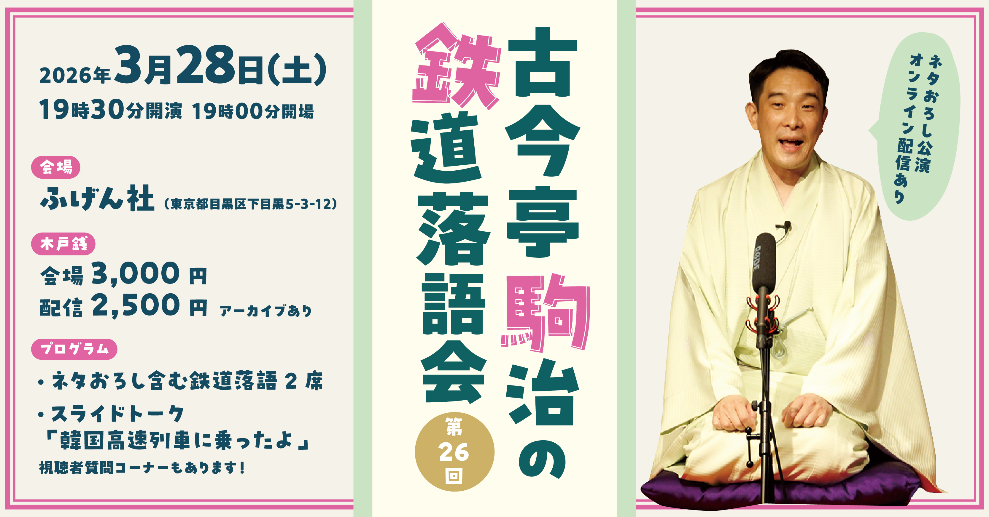 2026/03/28(土) 古今亭駒治の鉄道落語会 第26回会場+オンライン開催 Event このたび、2026年3月28日(土)19:30開演「古今亭駒治の鉄道落語会」第26回を開催致します。 古今亭駒治師匠は、「鉄道落語」という鉄道にまつわる新作落語を創作している噺家です。 駒治師匠が作り出すお話の「現実からちょっとだけはみ出した」ユニークな世界観は、鉄道マニアのみならず老若男女を魅了しています。 本公演のプログラムは、ネタおろしを含む鉄道落語2席と、旅写真が楽しいスライドトークの3本立て! 今回のスライドトークの演目は「韓国高速列車に乗ったよ」です。 毎回恒例となりました、視聴者の皆さんからのお便りに駒治師匠がお答えする、質問コーナーもございます。 ぜひメッセージやご質問をお寄せください!子どもから大人まで、鉄道好きはもちろん、マニアでなくともお楽しみいただける駒治師匠の鉄道落語会。 皆様のご参加を心よりお待ちしております。 ■開催概要 古今亭駒治の鉄道落語会 第26回 会場観覧+オンライン配信 ハイブリッド公演 日時: 2026年3月28日(土) 19時30分 開演(19時00分 開場) 出演:古今亭駒治 プログラム: ・鉄道落語二席(ネタおろし一席を含みます) ・スライドトーク「韓国高速列車に乗ったよ」 ・視聴者質問コーナー 木戸銭: 会場観覧 3,000円 オンライン配信 2,500円 会場: ふげん社 〒153-0064 東京都目黒区下目黒5-3-12 TEL:03-6264-3665 MAIL:info@fugensha.jp アクセス: JR目黒駅 西口より東急バス(黒01 黒02 黒07)「元競馬場前」下車 徒歩1分 東横線 祐天寺駅より東急バス(黒06)「元競馬場前」下車 徒歩1分 東横線 中目黒駅より東急バス(黒09)「大鳥神社前」下車 徒歩6分 JR目黒駅より徒歩15分 ■参加申し込み方法 会場観覧、オンライン配信(アーカイブ有)ともに、チケット購入制です。 チケットは下記オンラインストアよりお求めください。 https://fugensha-shop.stores.jp/ ◉会場観覧チケットのご購入はこちら ◉オンライン配信チケットのご購入はこちら オンライン配信は、3月31日(火)までアーカイブをご視聴いただけます。 ・オンライン購入が難しい場合は、銀行振込や店頭支払いなどで対応させていただくことも可能です。お気軽にふげん社(TEL:03-6264-3665 Mail:fugensha.store@gmail.com)までご連絡ください。 ・会場観覧チケットをご購入後にキャンセルされる場合は、開催日の2日前までにふげん社にご連絡ください。それ以降のキャンセルにつきましては、ご返金致しかねますので、あらかじめご了承ください。 ・配信チケット購入の際の注意事項はページ下部に記載しておりますのでご確認ください。 ■質問コーナーへの応募方法 駒治師匠への質問、応援メッセージなど、 投稿者名(ペンネーム可)とともに、下記のいずれかの方法でお送りください。 いただいたお便りは公演内で取り上げさせていただくことがございます。 締切:3/27(金) ※質問はおひとり様1つまで 180字以内でお願いします。 ①オンラインストアでチケットご購入の際に、【備考欄】に記入する。 ②メールで送信する。 件名:駒治メッセージ 本文:チケットご購入の際のお名前もお書き添えください。 宛先:fugensha.store@gmail.com ■出演者プロフィール 古今亭駒治 1978年(昭和53年) 東京都渋谷区幡ヶ谷生まれ 2003年(平成15年) 玉川大学卒業後、古今亭志ん駒に入門 「駒次」 2007年(平成19年) 二つ目昇進 2010年(平成22年) 共同通信社主催東西落語家コンペティショングランプリ受賞「公園のひかり号」 2013年(平成25年) 交通新聞社新書「鉄道落語」を共著(柳家小ゑん、桂梅団治、桂しん吉)で出版。「鉄道戦国絵巻」「都電物語」を収録 2017年(平成29年) しぶやらくご創作落語大賞受賞「10時打ち」 2018年(平成30年) 古今亭志ん駒死去にともない、古今亭志ん橋に入門。 真打昇進「駒治」に改名 現在 自作の新作落語で活躍。 身近なテーマを落語にしている。 特に鉄道落語は、寄席や鉄道落語会の他、鉄道博物館、東武鉄道ファンフェスタ、京急鉄道フェスタ、東急東横店イベント、池上線開業90周年祭、池上線雪が谷大塚車庫内での落語会、三陸鉄道復興寄席、荒川区都電写真展、都電落語会、弘南鉄道大鰐線、旧新橋停車場鉄道歴史展示室など、様々な場所で披露している。 出囃子:鉄道唱歌 紋:鬼蔦、青がえる 趣味:鉄道に乗ること 前駅を調査すること スワローズを応援すること CHAGE&ASKAの音楽を聞くこと 座右の銘:毎日が試運転 https://komaji.net/ ■配信チケットご購入の際の注意事項 ・配信は「YouTubeライブ」を使って実施いたします。ご試聴には、パソコン/スマートフォン/タブレットが必要になりますので、予めご用意ください。 ・3月31日(火)までアーカイブをご覧頂けます。 ・ふげん社ストアでご購入後に表示されるPDF(ファイル名:260328_komaji_online.pdf)をダウンロードください。ファイル内に視聴URLが掲載されています。もし不具合がありましたら、ふげん社(TEL:03-6264-3665 Mail:info@fugensha.jp)までご連絡ください。 ・ご購入者限定でご覧いただける配信です。SNS等へのURLの転載や、動画