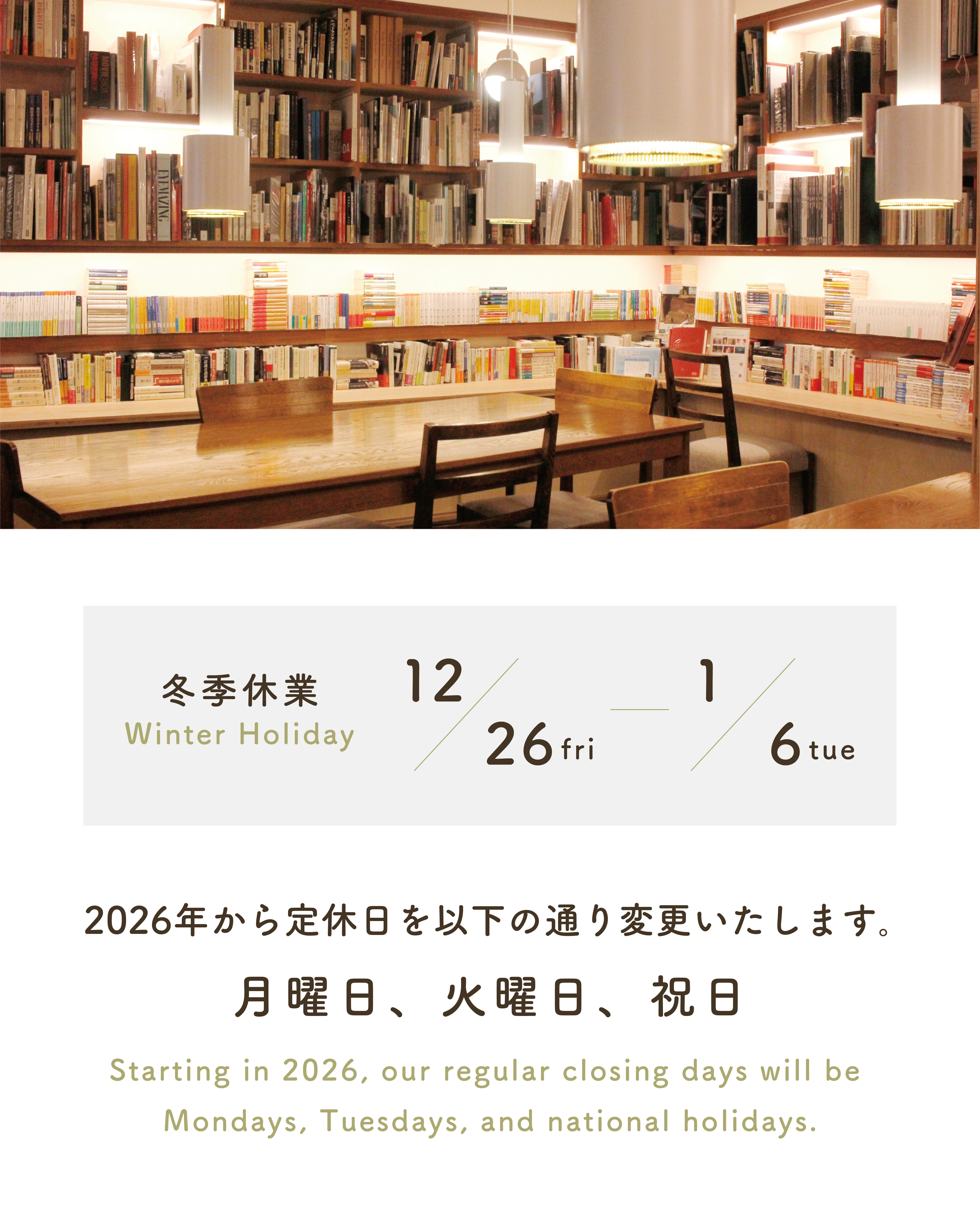 お知らせ 冬季休業+2026年定休日変更のお知らせ 2025.12.25 NEW 年の瀬も押し迫ってまいりましたが、いかがお過ごしでしょうか。 ふげん社は【12月26日(金)〜1月6日(火)】の期間、冬季休業とさせていただきます。 年始は1月7日(水)より営業を再開いたします。 オンラインストアは稼働しておりますが、休業期間中のご注文につきましては、1月7日(水)より順次発送いたします。 また、2026年より定休日を【月曜日・火曜日・祝日】に変更させていただきます。 ギャラリー、ブックカフェともに同じ定休日となりますのでご注意ください。 2025年も大変お世話になりました。 今年は13の展覧会を開催し、9冊の出版物を世に送り出すことができました。 弊店へ足を運んでくださる方や、いつも活動を応援してくださる皆様のおかげです。ありがとうございます。 皆さまどうぞお身体にお気をつけて、良いお年をお迎えください。 FUGENSHA will be closed for the winter holidays from Friday, December 26 to Tuesday, January 6. Please also note that beginning in 2026, our regular closing days will change to Mondays, Tuesdays, and national holidays. Thank you very much for your continued support throughout 2025. This year, we were fortunate to hold 13 exhibitions and publish 9 titles. None of this would have been possible without those who visit our space and everyone who consistently supports our activities. We are truly grateful. Wishing you good health, and we hope you have a wonderful New Year.